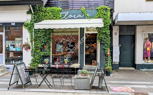 Floras café er super hyggelig, og stemningen er god. Vi fik det sidste ledige bord ved 14 tiden.nDer er flotte kager, god kaffe og kølig vin i lange baner. Det eneste der mangler er en lille ret til de veganske kunder og Low carb til diabetikere.