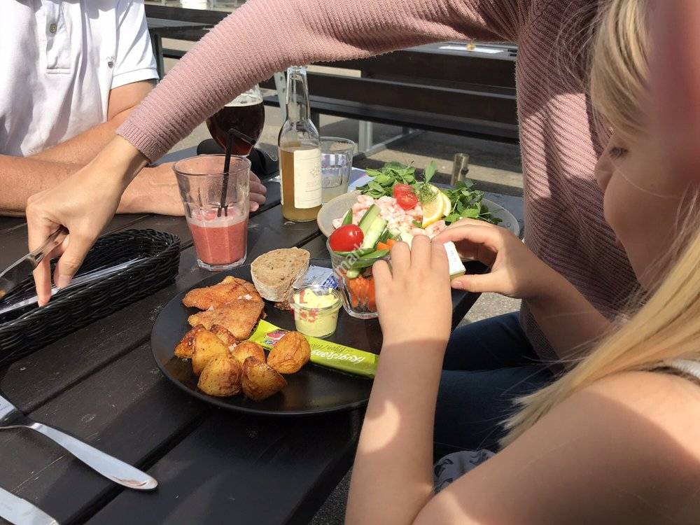 Spiser frokost, min kæreste og jeg fik smørstegte rødspætte fileter og min søn og hans kæreste fik håndpillede rejer Til rødspætteerne var der en lækker sommersalat og pickles, rejerne var på lyst brød Det smagte dejligt og præsenterede sig flot på tallerknen Jeg fik en planke øl til, som er 4 små glas med forskellige øl fra pilsner og over i det mørke porter artige øl Vejret viste sig fra den gode side og vi sad ude og spiste