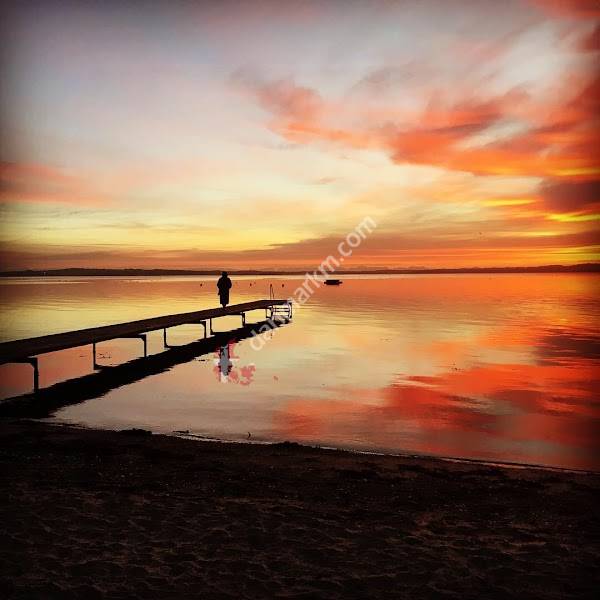 Hyggeligt lille grønt område med en badebro og nogle bænke smuk udsigt ud over vandet...